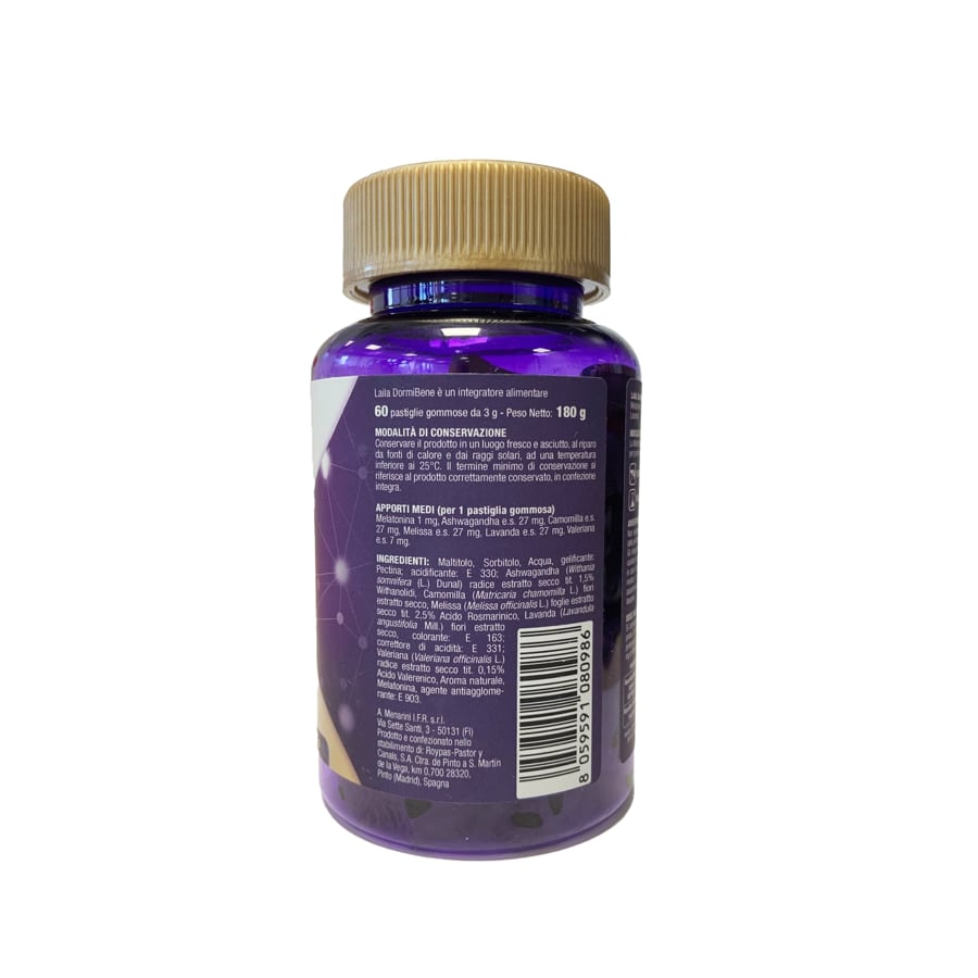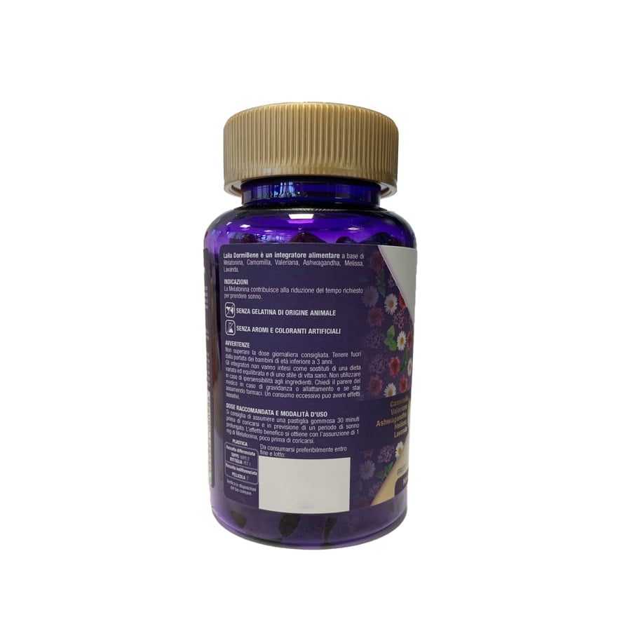 Laila Dormibene è un integratore alimentare a base di melatonina, camomilla, valeriana, melissa, lavanda e ashwagandha utile per favorire il rapido addormentamento.