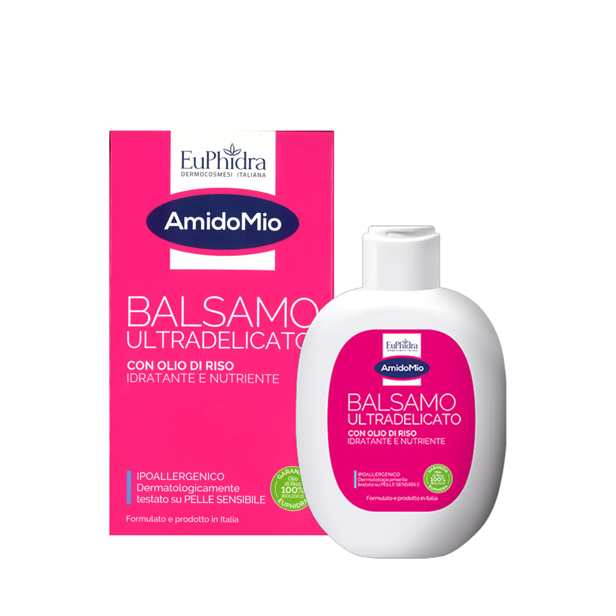 Euphidra AmidoMio Balsamo Ultradelicato è un trattamento dopo shampoo ad uso frequente ad azione districante, illuminante, nutriente ed emolliente. Supporta la struttura del capello e l'equilibrio del cuoio capelluto rendendo i capelli morbidi e luminosi. Facile da risciacquare e adatto anche ai più piccoli.