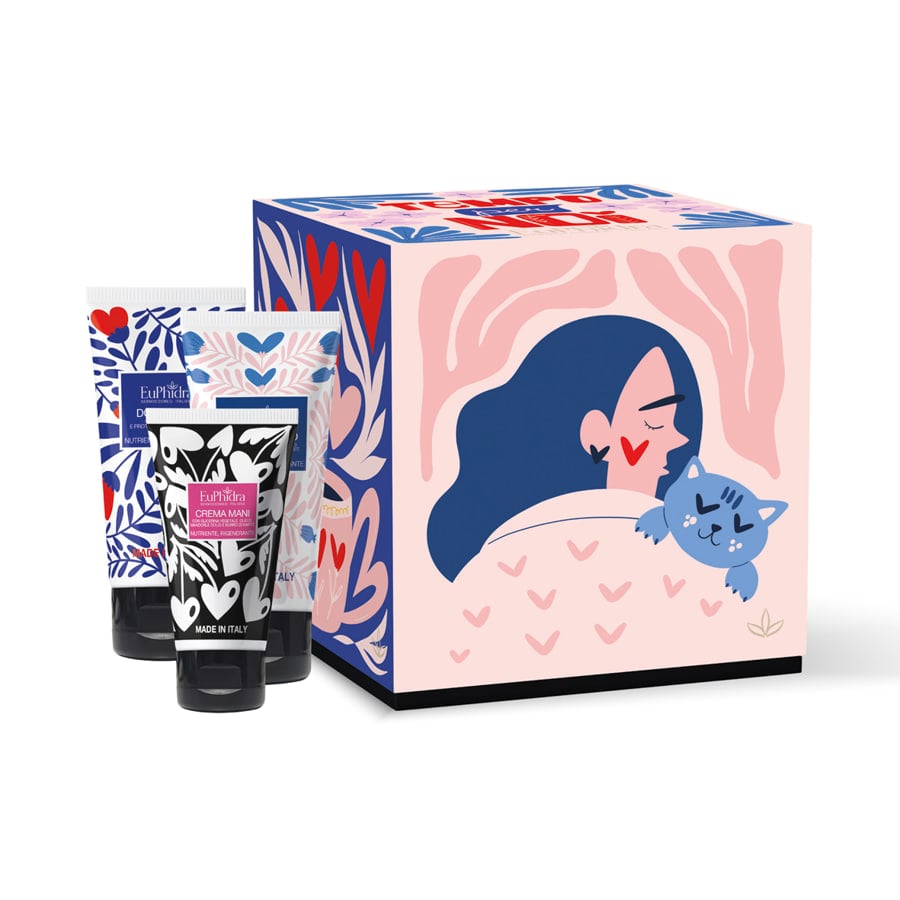 Euphidra Tempo per Noi è un elegante cofanetto benessere che unisce cura della pelle e piacere sensoriale. Tre prodotti formulati con ingredienti selezionati per idratare, proteggere e coccolare il corpo in ogni momento della giornata: