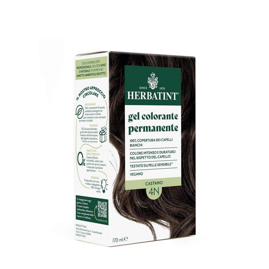 La formula del Gel Colorante Permanente Herbatint 4N Castano 170 ml è testata su pelle sensibile, offre la copertura del 100% dei capelli bianchi e un colore intenso e duraturo dall’effetto naturale.
