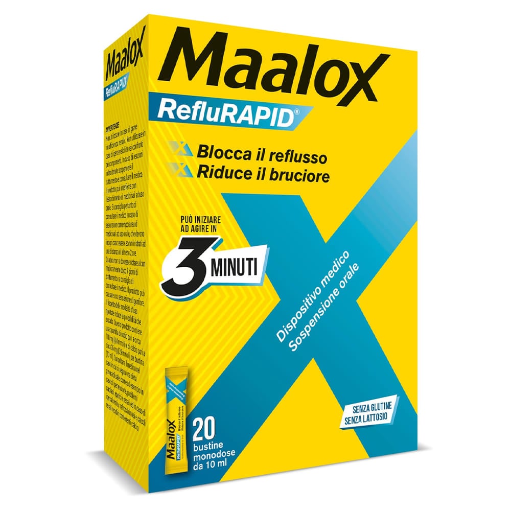 Maalox RefluRAPID è un dispositivo medico ad azione meccanica a base di Sodio Alginato, bicarbonato di sodio, sodio carbonato e calcio carbonato, formulato per svolgere 3 azioni sinergiche: bloccare rapidamente il reflusso acido, ridurre il bruciore e proteggere la mucosa dell'esofago. Maalox RefluRAPID è un dispositivo medico indicato per il trattamento del reflusso gastro-esofageo al fine di ridurre i sintomi ad esso correlati, come ad esempio: bruciore, pirosi gastrica in gravidanza, esofagite da reflusso, rigurgito acido, cattiva digestione, tosse e infiammazione laringo-faringea.