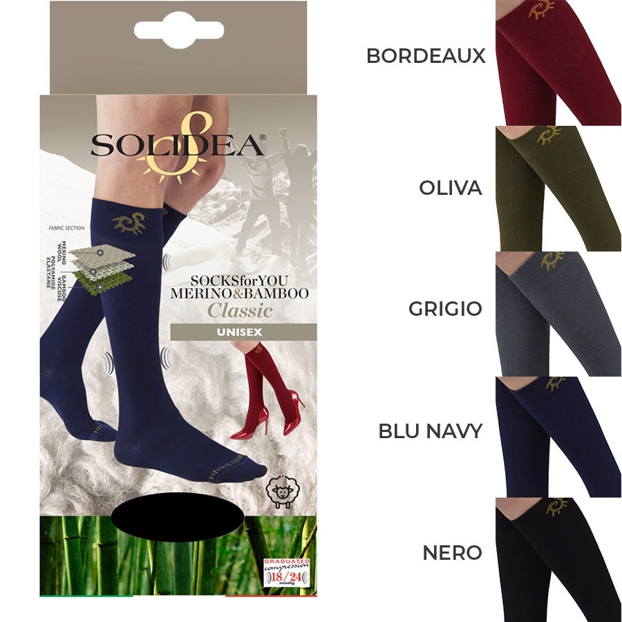 Gambaletto unisex a compressione graduata 18/24 mmHg con pregiato filato di bamboo e lana merino. Il dispositivo è indicato per la gestione e l'alleviamento del ritorno venoso e linfatico, per prevenire uno o più disturbi della circolazione (p. Es., Edema, trombosi venosa profonda (TVP), varicosi, linfedema). Elevato comfort e look elegante sono assicurati! Il tessuto della maglia è realizzato in 3 strati formando un effetto sandwich che crea un “microambiente” permettendo la traspirazione e la termoregolazione, mantenendo la cute asciutta.