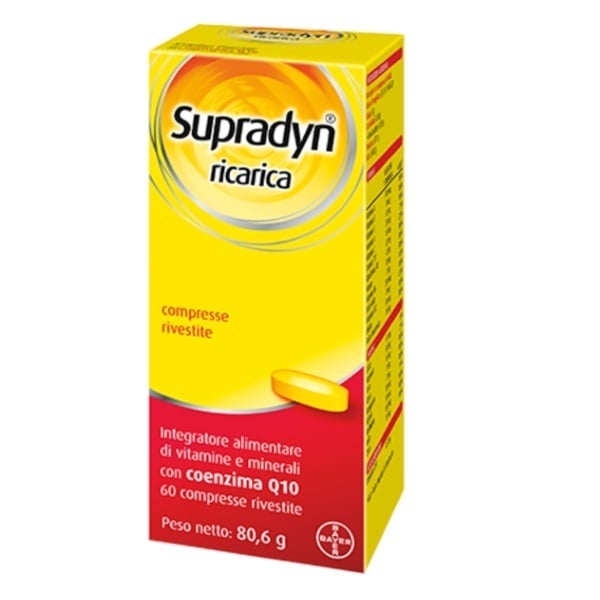 Supradyn è un integratore alimentare di 13 vitamine e 9 minerali con Coenzima Q10specificamente formulato per assicurare un adeguato apporto giornaliero di micronutrientinei casi di aumentato fabbisogno fisiologico o di ridotto apporto con la normaledieta. Confezione da 60 compresse.