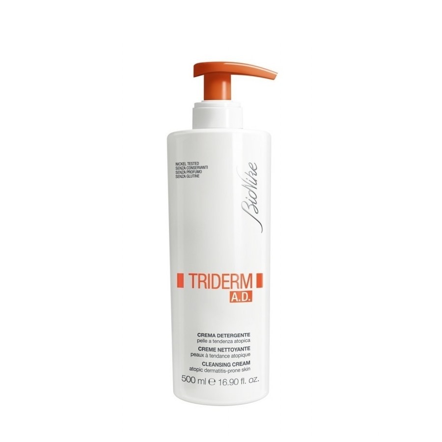 BioNike TRIDERM A.D. CREMA DETERGENTE Crema detergente a potere schiumogeno moderato, adatta per corpo e capelli. Ad elevata tollerabilità e con proprietà rilipidizzanti, è indicata per la detersione quotidiana di neonati, bambini e adulti con pelle a tendenza secca. Attenua secchezza, irritazione e prurito, donando immediato sollievo. Nickel tested. Senza glutine.