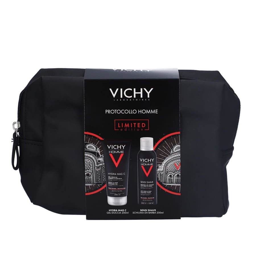 Contiene Hydra Mag C gel doccia e Sensi Shave schiuma da barba, due prodotti complementari per idratare, detergere e proteggere la pelle.